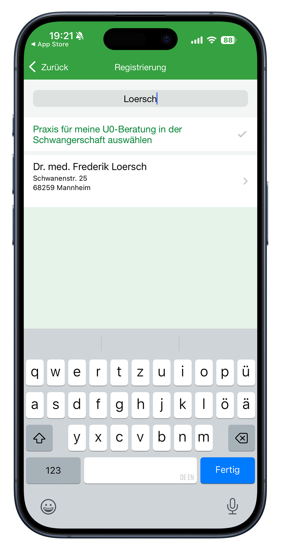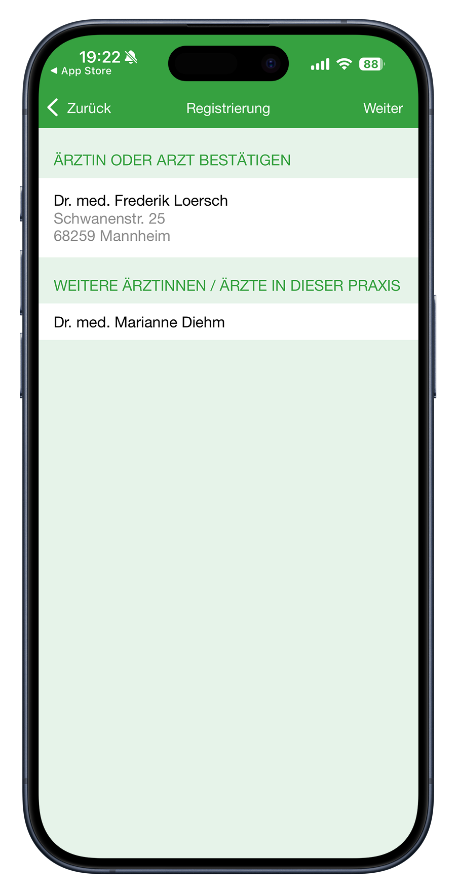 Sobald Sie unsere Praxis gefunden haben müssen Sie die Auswahl bestätigen indem Sie auf den Weiter-Button klicken.