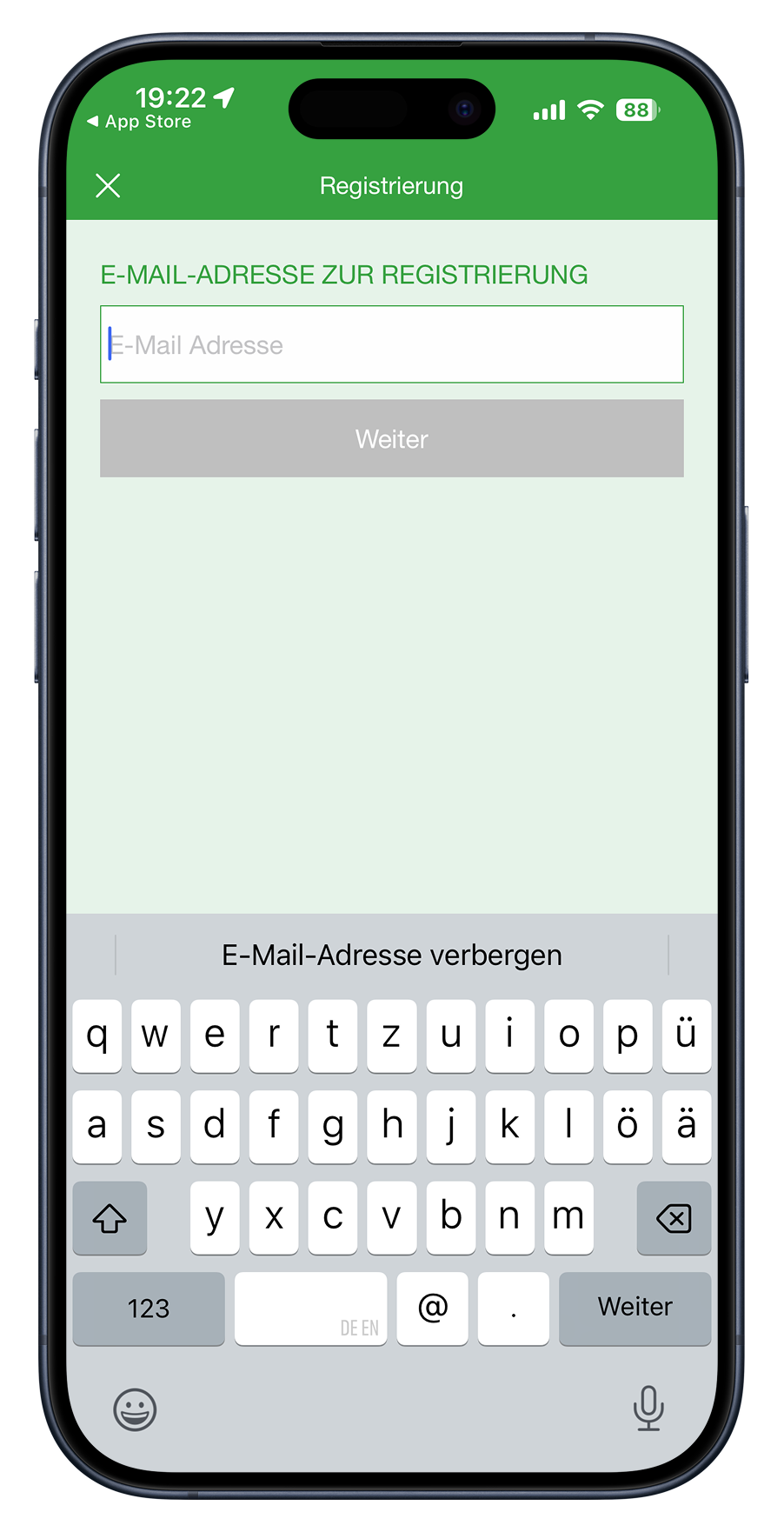 Nachdem die Auswahl der Praxis bestätigt wurde können Sie mit der Eingabe Ihrer persönlichen Daten fortfahren. Sie werden nach Ihrer E-Mail-Adresse gefragt und müssen im Anschluss ein persönliches Passwort vergeben.